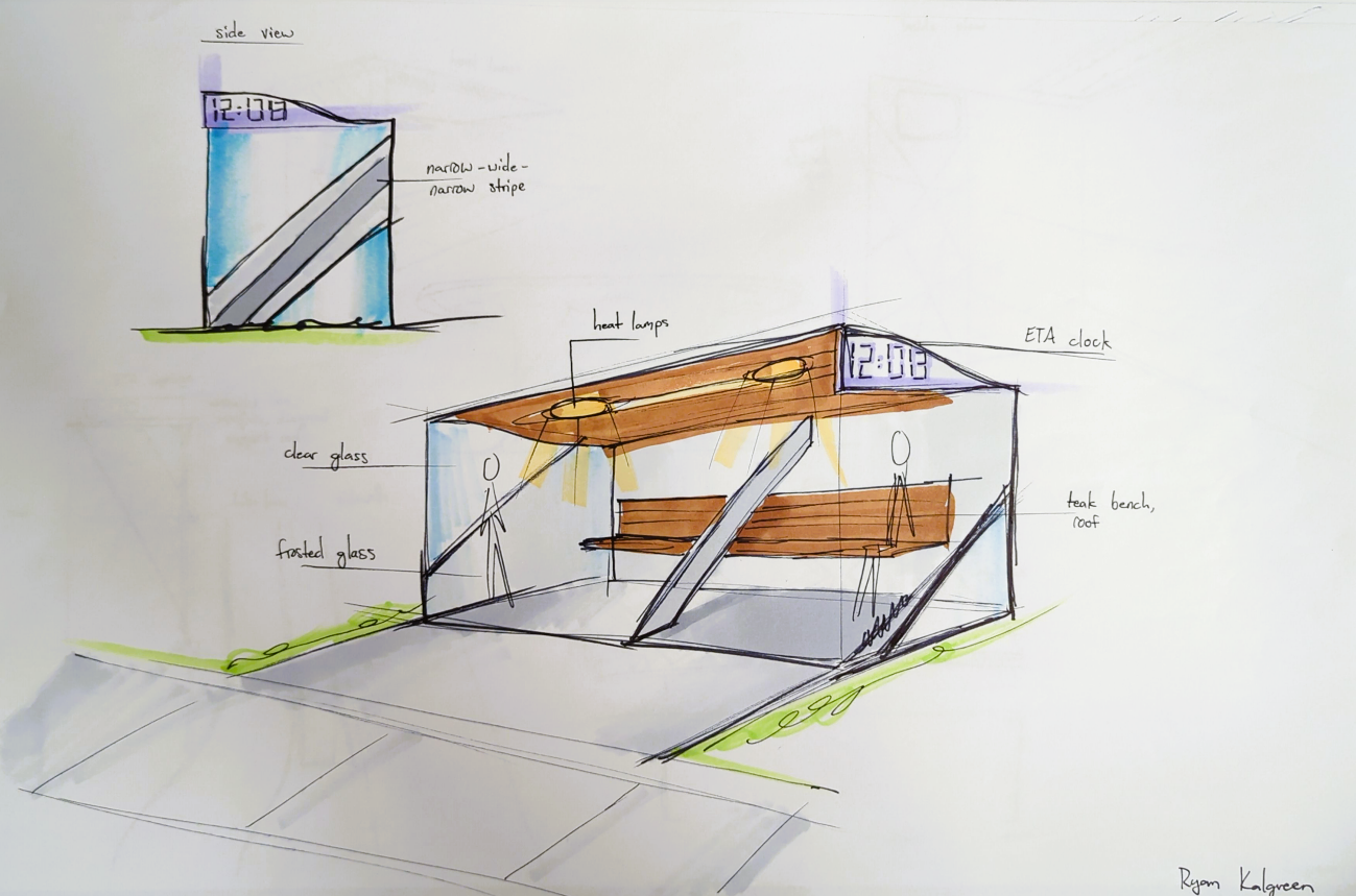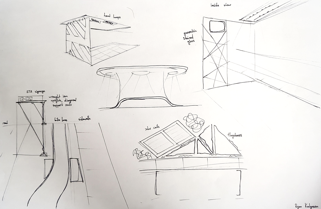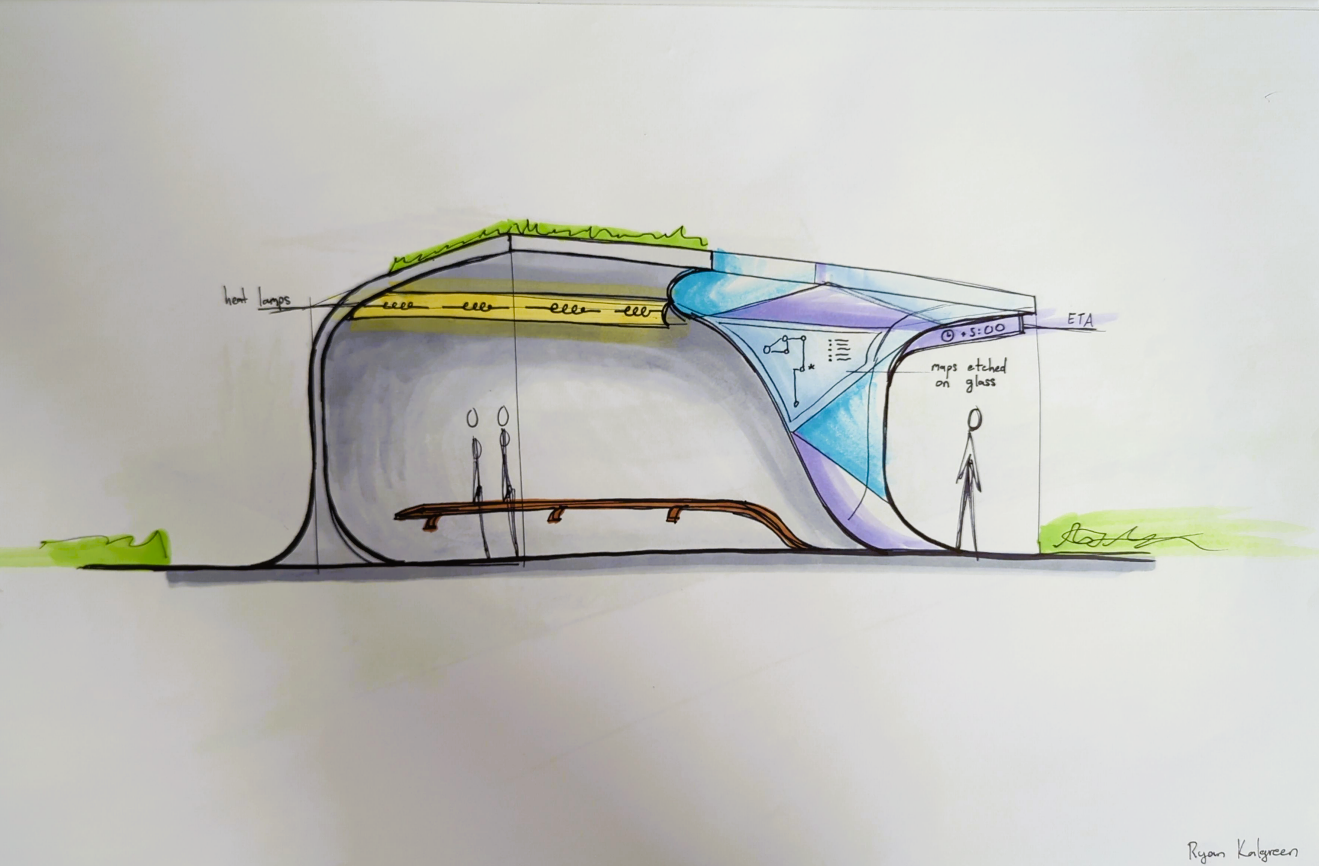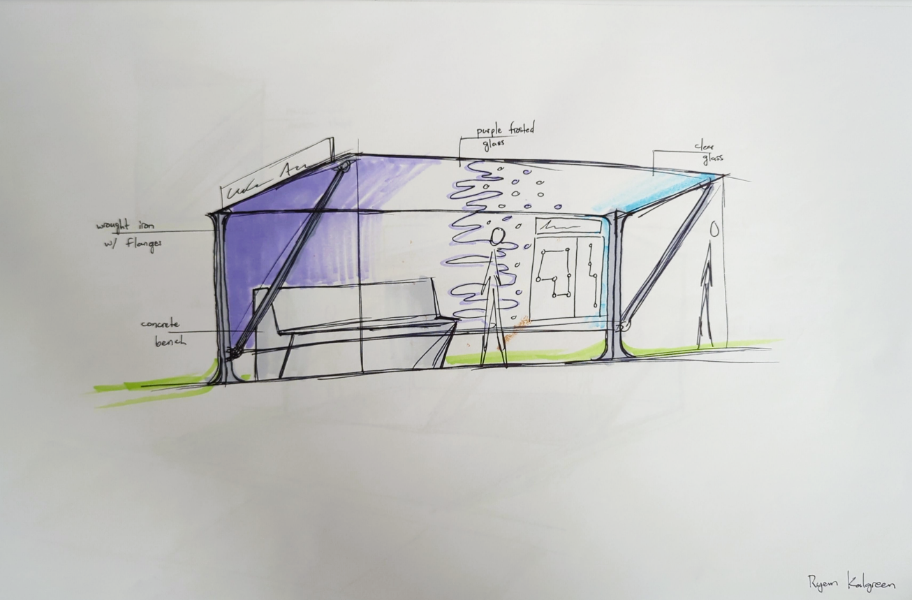 For a class called Introduction to Industrial Design Methods, one of the projects was to develop a design for a bus stop on Northwestern’s campus. Design work took place over several weeks, and we were challenged to incorporate elements of existing campus architecture, university iconography, as well as features/amenities we would like to see.