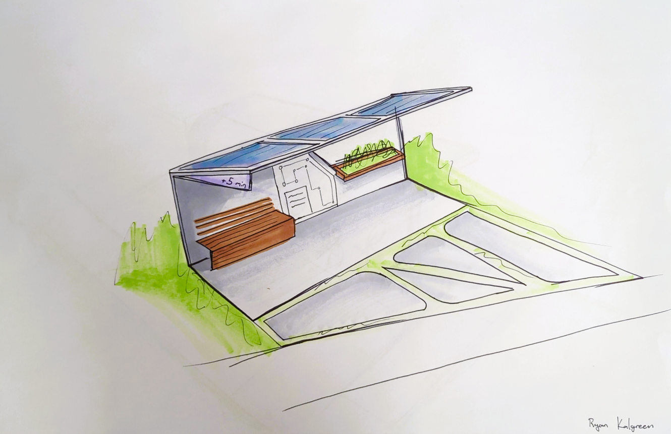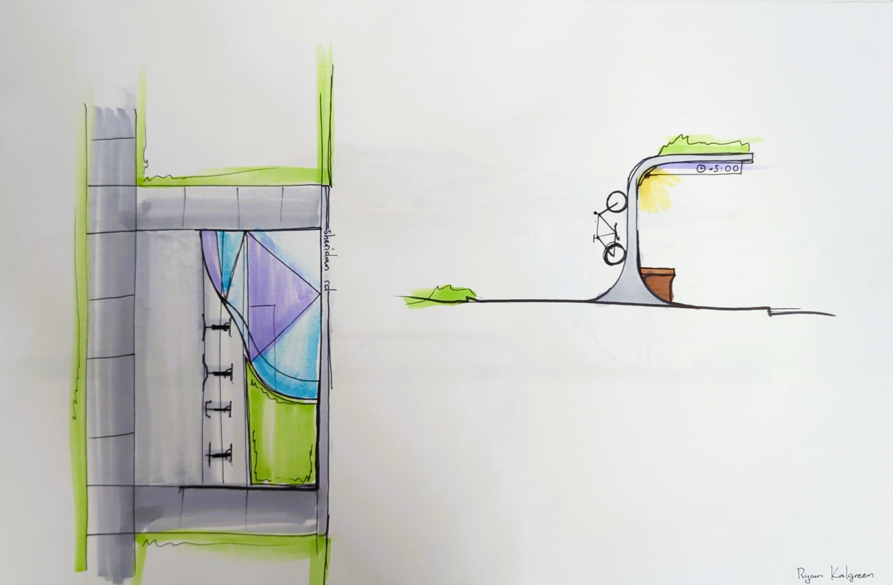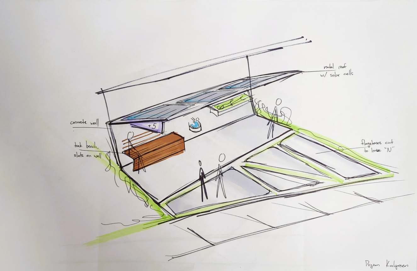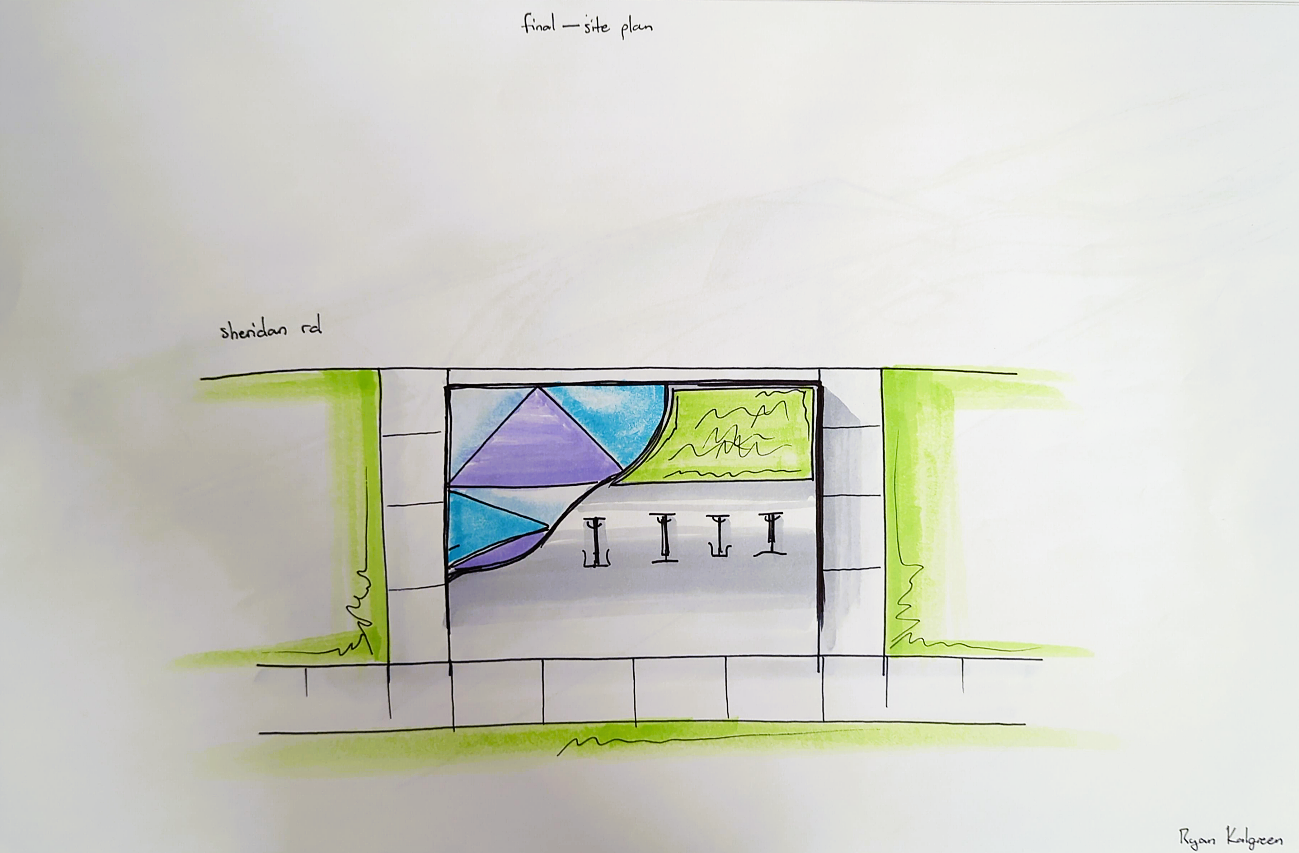For a class called Introduction to Industrial Design Methods, one of the projects was to develop a design for a bus stop on Northwestern’s campus. Design work took place over several weeks, and we were challenged to incorporate elements of existing campus architecture, university iconography, as well as features/amenities we would like to see.