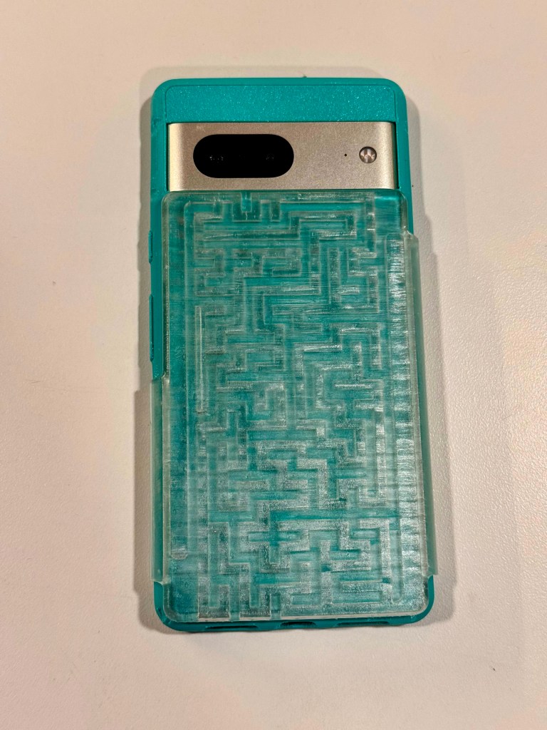 Printed from TPU and clear resin, this case has a ball-bearing maze on the back.