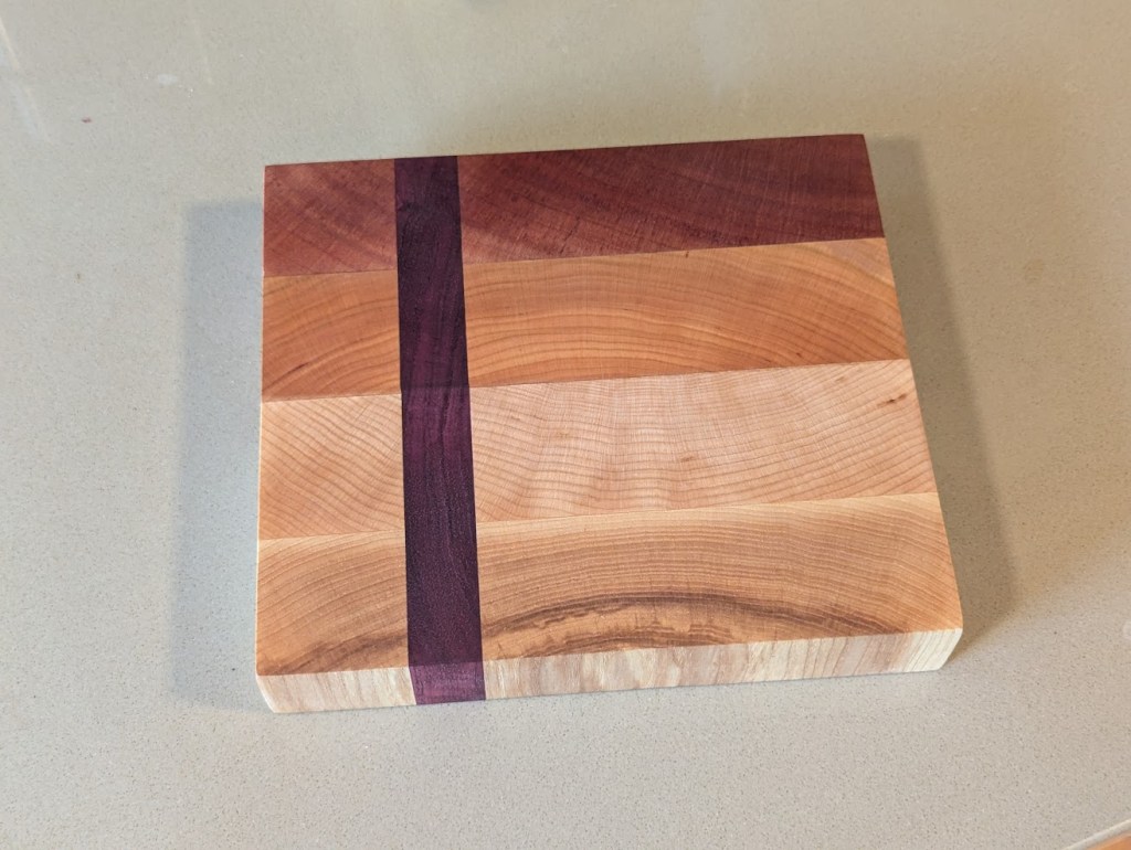A gift for my parents, made from purple heart, african mahogany, cherry, maple, and white oak.