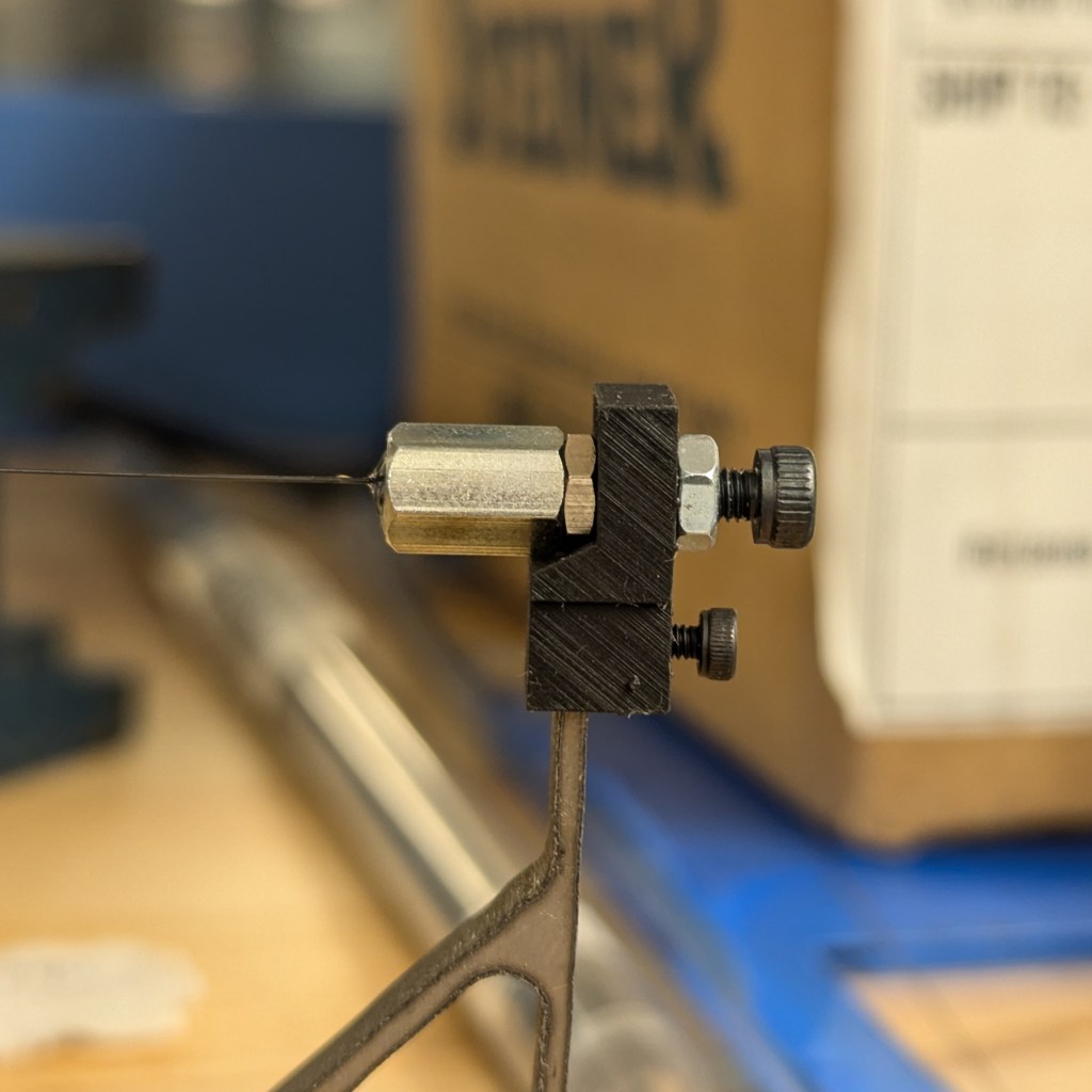 We then developed a set of machined aluminum couplers, using precision alignment jigs and a mix of machined acrylic and fishing tackle for holding the wire. This system was iterated on several times and ended up being our final approach.